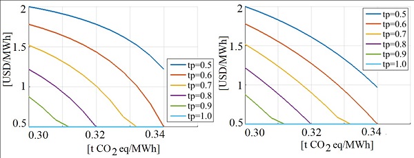 According to section 2, two scenarios of environmental impact (emissions) reduction are analyzed. These scenarios are made according to the decision maker's perspective on Emissions and Investment Cost (Carbon Price). The points of these scenarios were obtained for constant efficiency levels (constant t-norm) through Particle Swarm Optimization (PSO) method.