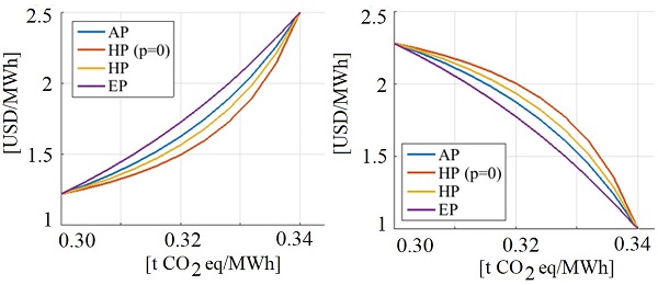 The curves are obtained from the solutions obtained with the PSO for different efficiencies and intersection operators (t-norms). In section 3.2. the societal perspective is studied, while in section 3.3. the production chain perspective is studied, in section 3.4. a comparison is made of the intrinsic costs in both scenarios and finally in section 3.5. an overall comparison is made of the curves for the different t-norms, with respect to the indices (emissions and investment costs) and the intrinsic cost (IC).