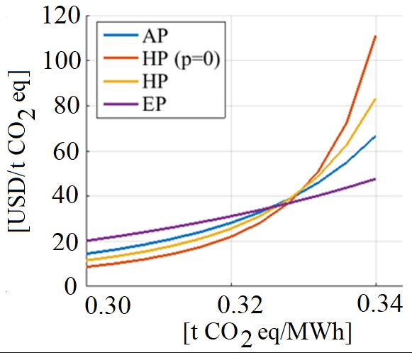 In both scenarios (production chain and society), the EP is the most demanding with respect to the attribute curve analyzed (Section 3.5). In addition, Einstein's product has the most uniform intrinsic cost, which would be an advantage to avoid excessive prices and high penalties. In the case that the regulator wants to reduce emissions by increasing the cost of the investment, it will have a better economic valuation with a greater decrease in emissions as the cost increases (slope of the curve).