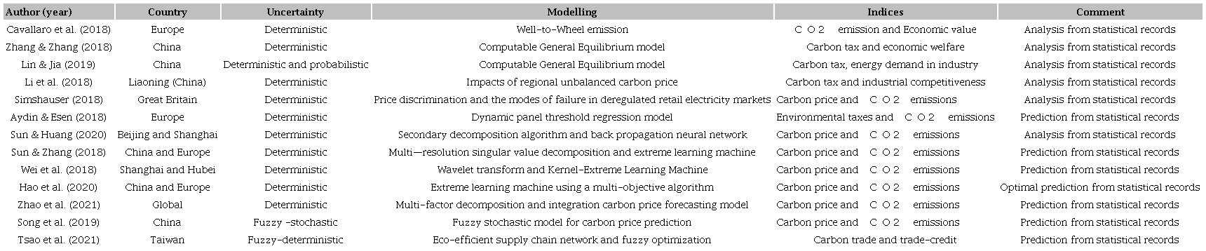 Table 1 shows a summary of the present proposals of carbon price and emissions with: country of analysis, sources analysed, linear or non-linear modeling, type of uncertainty, resolution methodology and limitations. Most of the important published works are carried out using deterministic models, or in the best of cases, mixed with stochastic models. That is, they use classical models of mathematical programming, which have limitations in their formulation and quality of the results obtained (Camargo et al., 2018; Camargo, 2022b). It is observed that these proposals present complex methods, which require a large amount of data, in some cases require supervised learning and most do not consider the presence of uncertainty, but rather are statistical analyses. Some present proposals based on Machine learning (Janiesch et al., 2021) which has the disadvantage of requiring supervised learning. Others present techniques based on the impact on the market equilibrium. Computable general equilibrium (CGE) models are a class of economic models that use actual economic data to estimate how an economy might react to changes in policy, technology or other external factors (Robson et al., 2018; Pradhan & Ghosh, 2022).