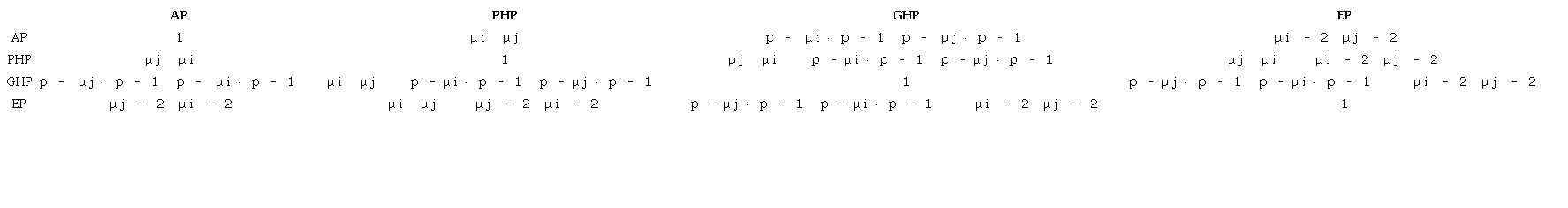 The numerator is associated with the t-norm of the row and the denominator with the t-norm of the column. In the columns, the Algebraic Product - AP, the Particular Hamacher Product - PHP, the General Hamacher Product - GHP and the Einstein Product - EP are represented in the numerators. In the rows, the intrinsic costs of the Algebraic Product - AP, the Particular Hamacher Product - PHP, the General Hamacher Product - GHP and the Einstein Product - EP are represented in the denominators.