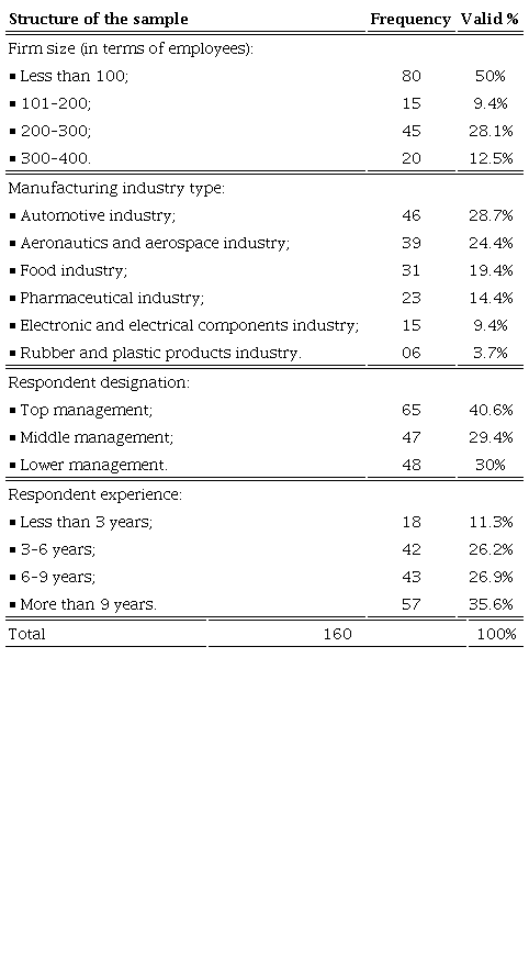 Using a database from the Ministry of Industry and Trade, an online survey was conducted in 2022 to test the hypotheses. The initial sample included informants involved in general management and business functions related to SCM in foreign manufacturing companies based in Morocco. After eliminating mailing errors, the sample contained 750 contacts. Only responses with less than 10% missing values were accepted. The EM algorithm (Dempster et al., 1977) was used for responses with 0.6% missing values. At the end of the survey period, 160 completed questionnaires were well received by respondents, representing a response rate of 21.3%. This is, in effect, a medium sample size (Kline, 2011) and a number of observations greater than the free model parameters as a condition for structural model identification (Fabrigar et al., 2010; Hair Junior et al., 2010; Kline, 2011). Table 1 categorizes the respondent firms by the product sector. Based on a procedure suggested by Armstrong & Overton (1977) regarding the likelihood of late response bias, the results of t-tests suggested no difference at the 0.05 level between early and late respondents, indicating a minimal risk of response bias. Harman's one-factor test was used to check common method bias.