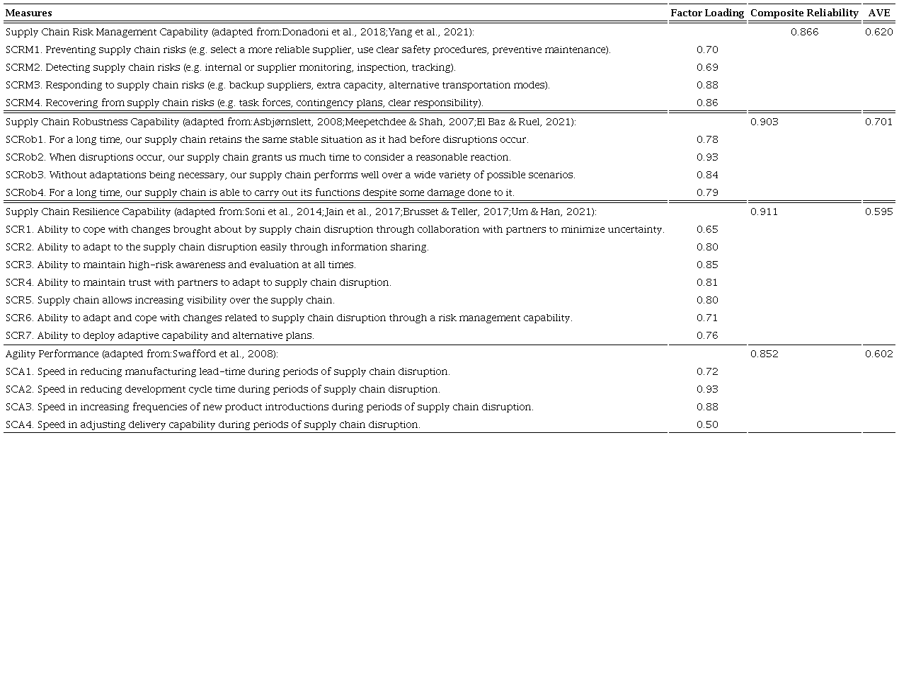 Four items from Donadoni et al. (2018) and Yang et al. (2021) were adapted to measure SCRM reflecting a partner company's capability to prevent, detect, respond to, and restore supply chain risks. SCRob capability was measured by four items adapted from Asbjørnslett (2008), Meepetchdee & Shah (2007) and El Baz & Ruel (2021). SCR capability consists of seven elements adapted from Soni et al. (2014), Jain et al. (2017), Brusset & Teller (2017), and Um & Han (2021). AP is operationalized by four items adapted from Swafford et al. (2008) reflecting the speed at which a firm's supply chain can be responsive to customer expectations.