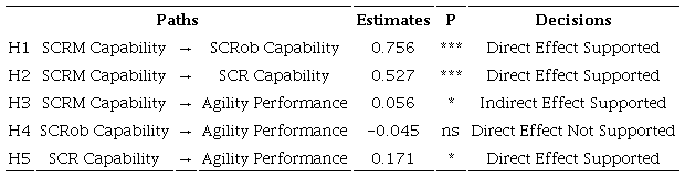 Based on the direct effect of path analysis, it was found that SCRM capability (0.756, p < 0.001) has a significant positive relationship with SCRob capability. SCRM capability (0.527, p < 0.001) has a positive and statistically significant relationship with SCR capability. SCR capability (0.171, p < 0.10) has a positive and statistically significant influence on AP. However, SCRob capability (-0.045, p > 0.10) has a negative but directly non-significant relationship with AP. Regarding indirect effects, the effect of SCRM capability on AP was mediated by SCR capability. Therefore, it has (0.056, p < 0.10) a positive and statistically significant indirect relationship with AP.