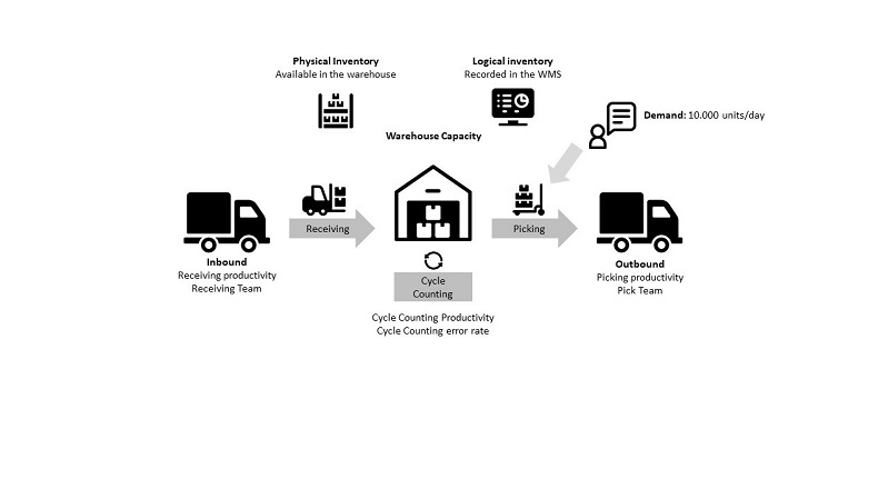 The second step involves constructing a Causal Loop Diagram (CLD), a tool designed to help researchers visualize how distinct system variables are interrelated through endogenous consequences (Sterman, 2000). The Stella® software was used to build the SD simulation. Figure 1 shows the warehouse modeled with operational errors in receiving (inbound process), order picking (outbound process), and cycle counting (CC process) generating IRI (Kang & Gershwin, 2005).