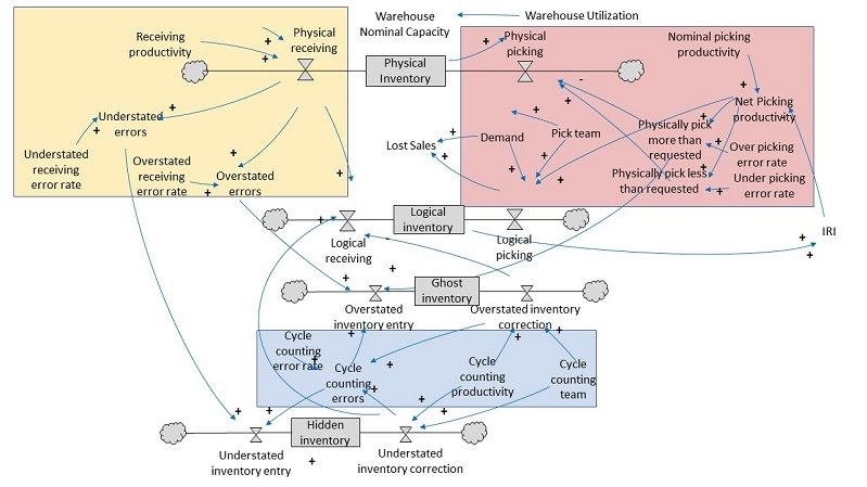 Originality: A causal loop diagram in detail of the IRI and CC variable's effects in receiving and picking processes is developed. IRI is separated into ghost and hidden inventory to represent the actual effects in WCU, LS, and PP.