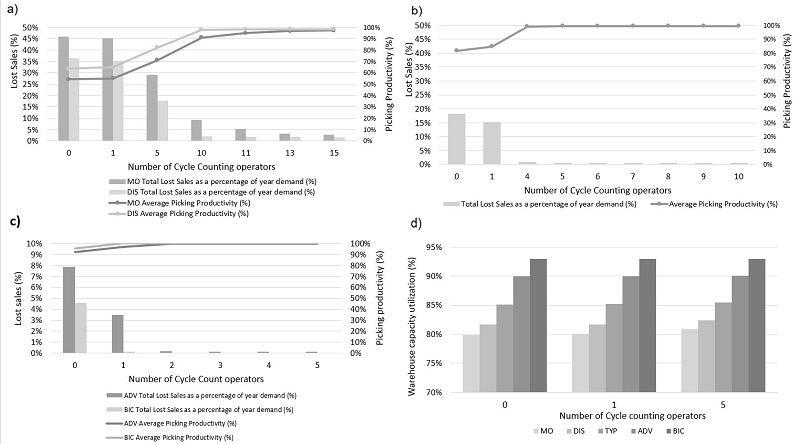 The simulation results are presented in Figure 3. Figure 33c demonstrate lost sales (in bars, left y-axis) and picking productivity (in lines, right y-axis) according to the number of CC operators simulated (x-axis). Figure 3a illustrates results for MO and DIS warehouses, whereas Figure 3c for ADV and BIC, due to the similarity of the indicators outputs. Figure 3d shows the WCU for MO, DIS, TYP, ADV, and BIC according to the number of CC operators (x-axis).