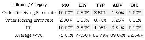 The WERC annual report traditionally classifies warehouses into five categories according to their performance indicators: order Receiving error rate, order Picking error rate, IRI, and WCU. The five warehouse categories are: