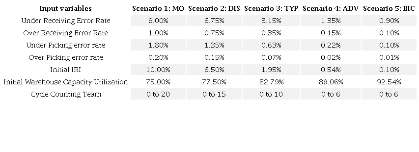 Once the premises of the simulated scenario are established, it is necessary to define the input and output variables to be analyzed. The input variables for the simulation scenarios are IRI, receiving error rate, picking error rate, cycle counting team, and warehouse capacity utilization (WCU). The input values are defined according to the Warehousing Education and Research Council (WERC) annual report, presented in section 3.5. This report summarizes real data from warehouses of different companies sizes that participate in the study.