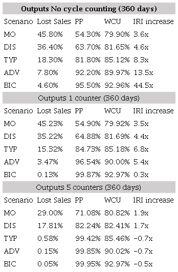 As seen in Table 3, a daily CC policy reduces IRI levels, consequently preventing lost sales and optimizing WCU. However, it is crucial to monitor warehouse performance indicators regarding transactional errors and drive them to better numbers. The CC works better if it is followed by the reduction of operational errors and improvement of picking and receiving accuracy: a MO warehouse with a team of 10 counters has more lost sales in a year than a BIC warehouse without any counting at all.