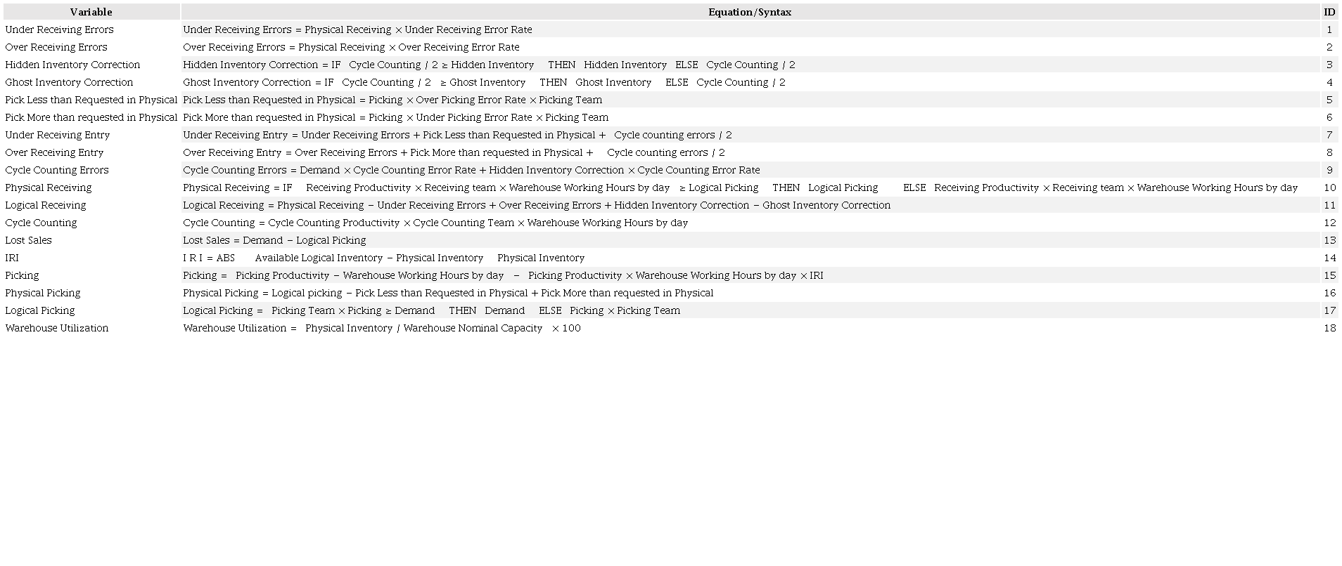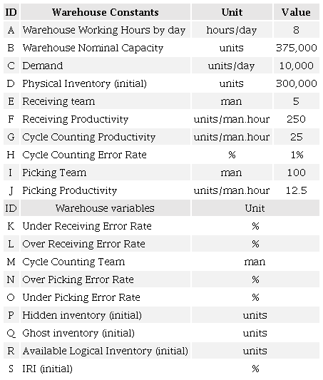 As seen in the SD model equations (Appendix B), receiving and picking error rates must be divided between under and over-error rates (Table 2) to generate Hidden and Ghost inventory. There is no such proportion rate in the literature. So, this research considered it as 90/10, supporting their decision by the research of Hachem et al. (2016) when the authors stated that larger volumes in receiving (quantity per operator) imply more chances of human errors affecting the physical inventory negatively. According to this rationale, since the receiving error rate for the MO warehouse in Warehousing Education and Research Council (2019) is 10%, it is converted to 9% under Receiving Error Rate and 1% over receiving error rate. Then, the input variables of Table 1 are converted, using the model equations (Appendix B), into the initial values of physical inventory, available logical inventory, hidden inventory, and ghost inventory.