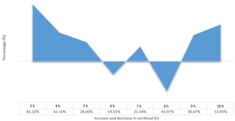 Regarding the workload of daily activities before the pandemic, there is a lower significance relationship (p = 0.019) than during the pandemic (p = 0.007). There was a migration of hours worked and an increase in total hours (an increase of 16.93%, with 939 hours more, n = 801) when comparisons were made between before (planned) and during (executed) the pandemic period (Figure 2).