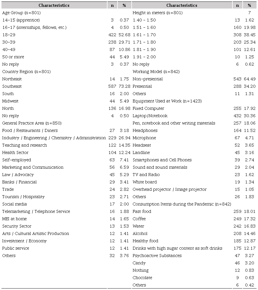 The study population comprised 801 individuals who made themselves available to answer the questionnaire and participate in the research. Based on the number of interviews from an infinitive population, the sample size of 801 was estimated with a statistical power test of 0.875 (with a 95% confidence coefficient) in accordance with the Cochran formula. The dataset was processed by SPSS® 23 software. The respondents characterized a response profile through basic questions, such as age, region of residence and work, height, profession area, and work model. Some questions were multiple choice, which allows an N greater than the total number of people in some cases. Regarding age, the profile of the respondents m is mostly in the age group of 18 to 39 years, with 82.49% of the total, as well as more than 90% are in the northeast and southeast regions of Brazil and height profile corresponds, in meters, from 1.51 meters to 1.90 m (corresponding to 96.38% of the answers). The profile of the area of a regular occupation is diversified, with a high number of respondents in an industrial area, such as chemistry, administration, and engineering.