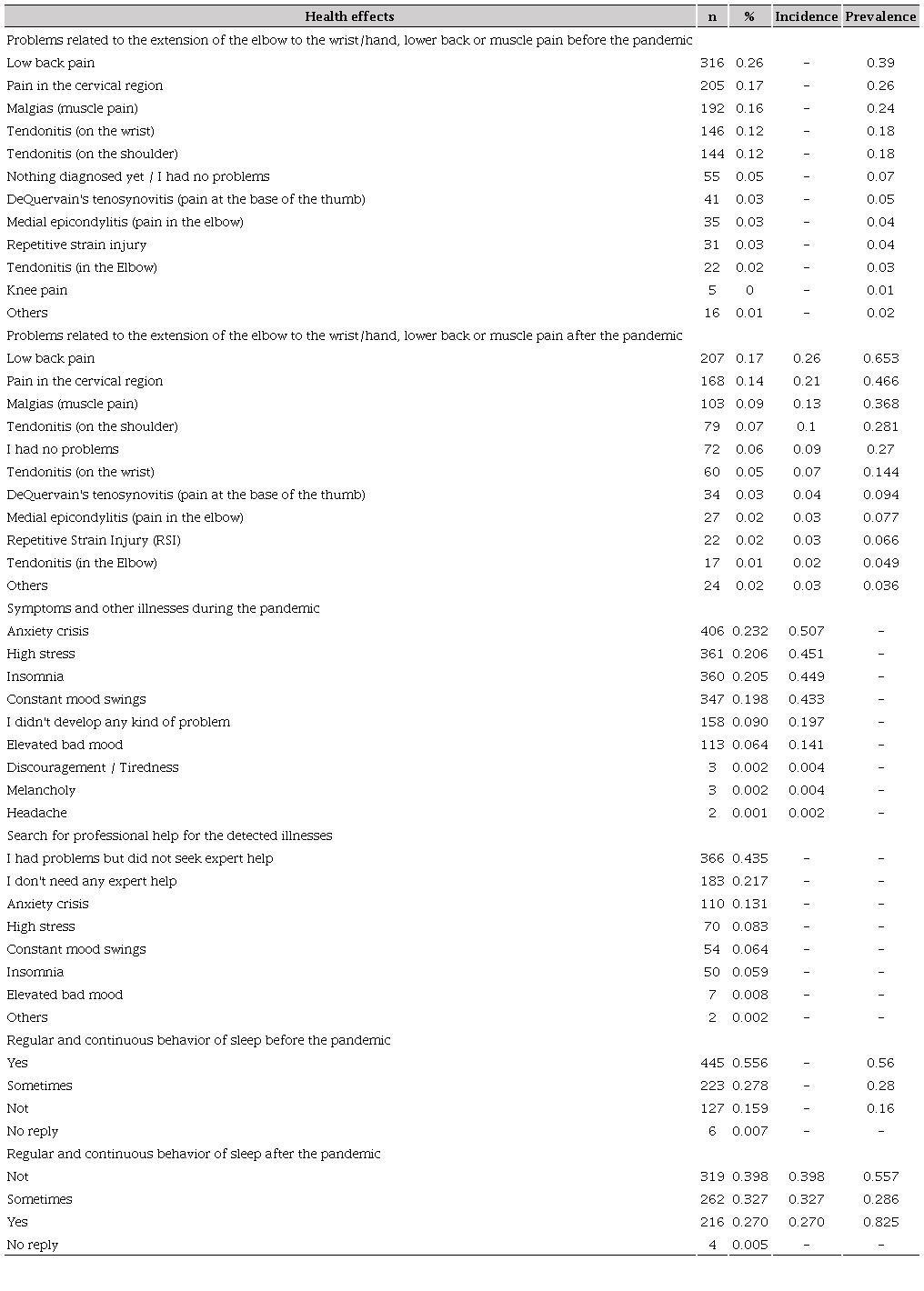 In addition to the millions of people infected by coronavirus 2, hundreds of thousands have died—and will die—from COVID-19. An anticipated wave of mental and behavioral problems is beginning to be documented—compounded by social and economic stressors and uncertainties—that will likely present a population health burden for months and years (Galea, 2020). Isolation can bring unpredictable consequences, with potential illnesses and domestic, mental, and work problems. Working in quarantine can be a challenge for several reasons. The new home office work models, even the face-to-face model with all the sanitary protocols and the hybrid models, diversify how work can be done. However, bodily and mental injuries and various problems can occur in these adaptations. A government agency recognized the term injures inaccurate and misleading, and the term work-related upper limb disorder was suggested as an alternative (Cucinotta & Vanelli, 2020). Physicians have a crucial role in the early recognition of these disorders and in stimulating appropriate ergonomic interventions to reduce their frequency and severity (Chamola et al., 2020). In addition to clinical care (injuries, pains, inadequate working postures, and mental health demands), people had to face the obligation to exercise their role as instruments of the means of production. Factors such as being in contact with the virus or fear of contagion in the workplace triggered more significant symptoms (Santamaría et al., 2021).