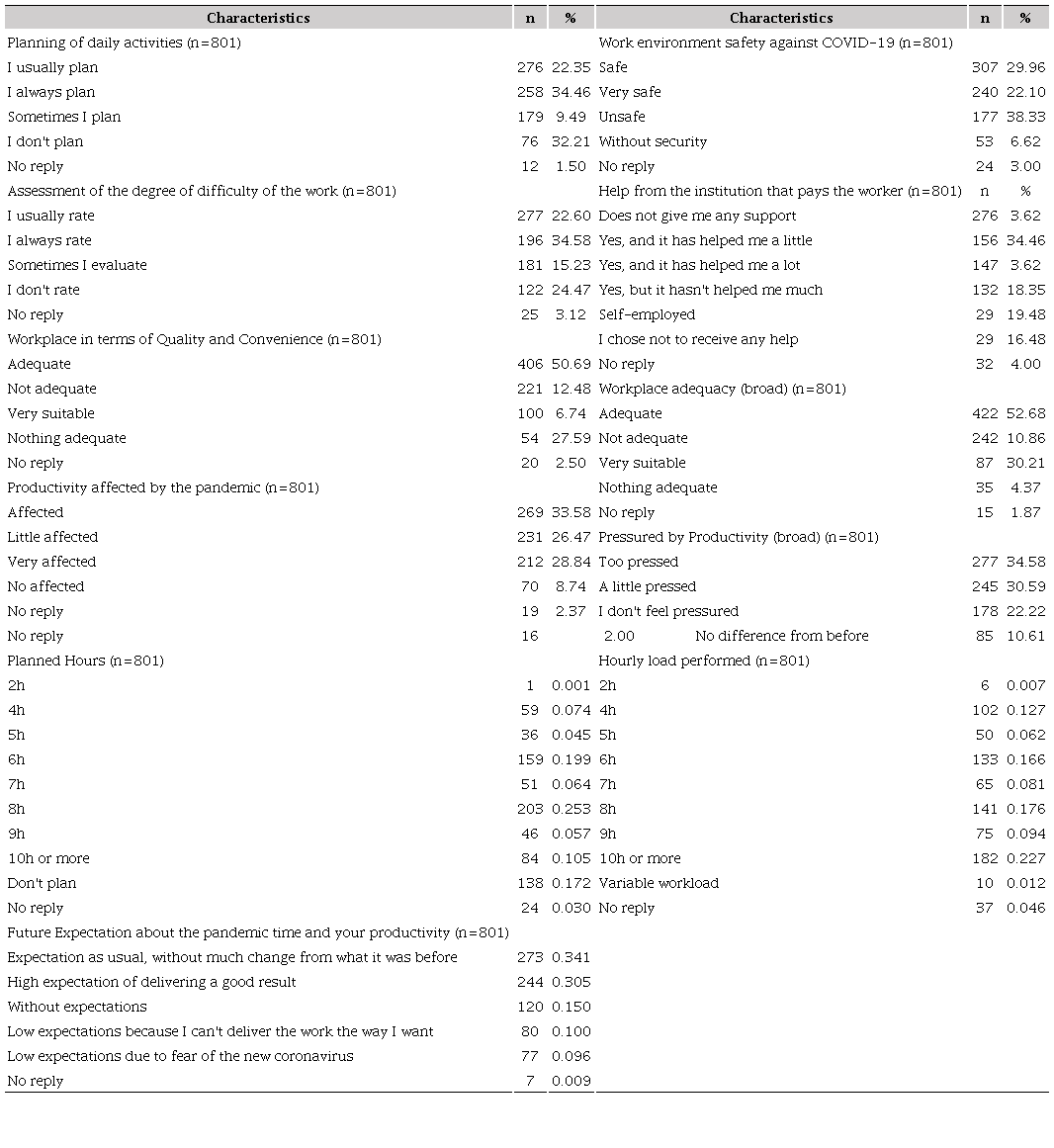 Based on these 3 profiles, all respondents were asked about their assessment of productive behavior in their workplace, demands on delivery of results, and perception of their productive efficiency during the pandemic period studied (Table 3). When asked about planning their daily activities, 66.29% (n = 713) of people had some planning, and 88.89% (n = 712) understood that their productivity was affected due to the pandemic. Companies during the pandemic period had a great need to deliver quick results, which led to pressure from them, which led to pressure from their employees, regardless of the work model (Deloitte, 2020).
