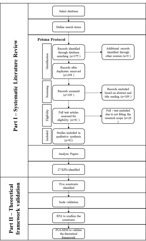 The search took place in December 2021 and resulted in a total of 375 publications. Then, after duplicate removal, there were 298 documents. An initial screening of publications that consisted in checking titles and abstracts was performed, aiming to discard those that did not fit within the scope of this research, resulting in 109 articles ranging from the years 2002 to 2021. The last step was full-text reading which generated a final list with 81 papers that were analyzed to compose the KPI list.