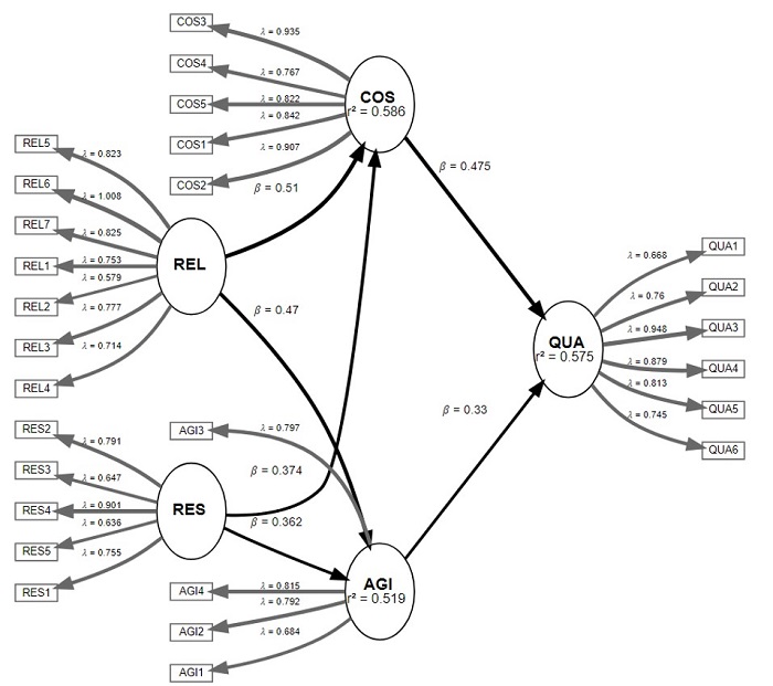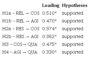 Regarding reliability, the healthcare supply chain reliability has a positive influence on healthcare supply chain costs (β = 0.510, p < 0.05), and has a positive influence on healthcare supply chain agility (β = 0.470, p < 0.05), therefore, hypotheses H1a and H1b are supported.
