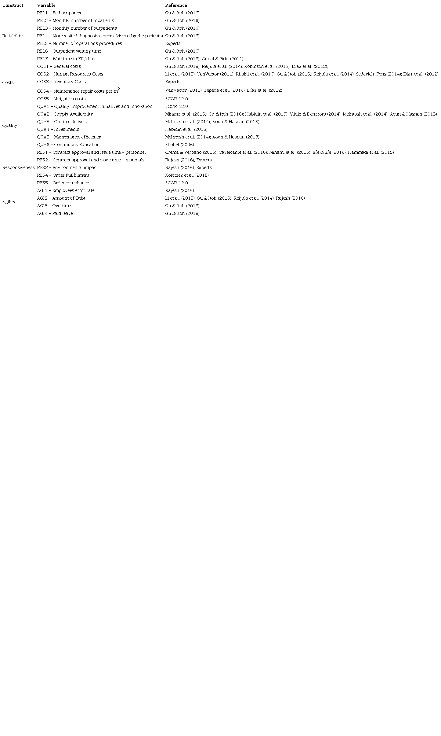 Based on the experts and in SCOR 12.0, we have grouped the KPIs into five dimensions (constructs) that function as building blocks of Healthcare Supply Chain Risk assessment. Healthcare supply chains are as reliable as their hospitals and clinics since these organizations are the interface with the clients, which are responsible for the entrance of revenue in the supply chain. Therefore, these organizations must be reliable, provide efficient services to patients while being cost-efficient, and have a good relationship with the upstream organizations (Senna et al., 2022, 2023). In this sense, we formulated the hypothesis H1a: