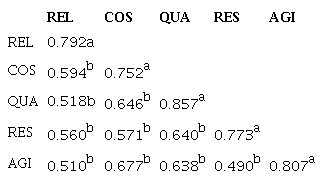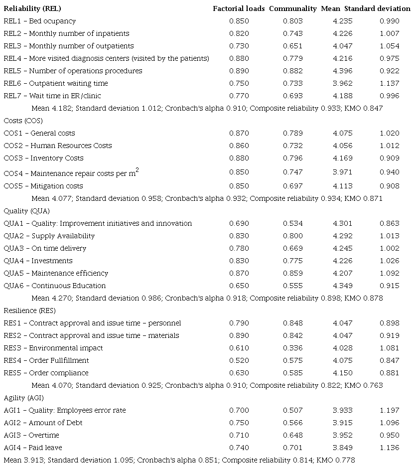 The verification of the combination of observable variables in factors (Constructs) occurred through an Exploratory Factor Analysis (EFA) between blocks, preceding the PLS-SEM. The factorial loads (Table 3) show values above 0.5, as recommended by Hair Junior et al. (2013), to measure the contribution of each observable variable in the construction of the construct. In the EFA process and in addition to factorial loads, other important indexes were verified. Based on Mardia (1971), Hair Junior et al. (2013), Kline (2011), Lorenzo-Seva et al. (2011) and Tavakol & Dennick (2011):