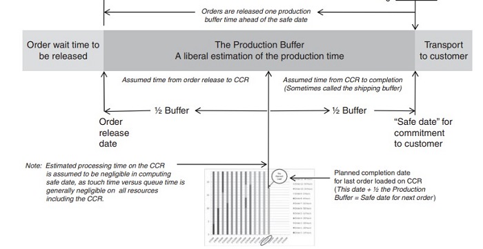 Figure 1 shows a synthesis of the S-DBR concept applied in MTO environments. The histogram at the bottom of the figure represents the CCR planned load. Adding the order processing time and half a PB gives a safe date that can be promised to a customer. Subtracting a PB from this date logically gives the release date of production material to the shop floor.