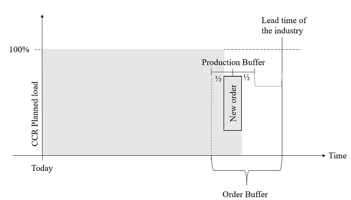 To clarify this concept, consider the following example adapted from Souza & Baptista (2010): a company works eight hours a day, five days a week, with a BP of 5 days (40 hours of work). The industry standard term is 20 days or 160 hours of work. On a given day, an order from one of its customers is received. To accept this order, the company calculates the planned load on the CCR, which includes the order under review, resulting in 90 hours. The promised delivery time for this order should be the planned load plus half a production buffer.