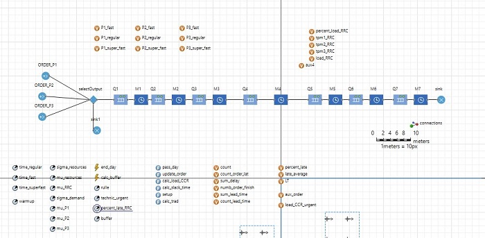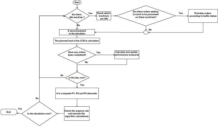 The model built in the present work is axiomatic, that is, directed to idealized models of the problem, since the main objective was to evaluate and compare the methods proposed in the literature (Suh et al., 1998; Bertrand & Fransoo, 2002; Kulak et al., 2010). The first step of constructing the computational model was to define the production line. Thürer & Stevenson (2018) comment that in simulations of the DBR method, a direct flow is normally used. For our model, we chose linear and direct flow, with the CCR located in the middle of the flow, since, as pointed out by Lee et al. (2010), when a CCR is in other positions, the assumption of the ½ buffer rule may not be valid. Our simulated theoretical production line involved seven machines, with machine number 4 (in the middle of the production flow) being the CCR of the model. Orders were generated daily; that is, at the end of each day the demands for each product were computed and production orders generated for the following day. Three different delivery times were defined for three different products, P1, P2 and P3, whose demands were stochastic (see section 3.2) and equally different. The model built in the Anylogic software is shown in Figure 3. The flowchart in Figure 4 illustrates the system logic of the computational model.