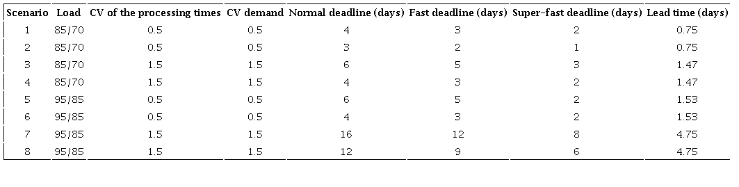 Loads of 85% and 95% occupation of the capacity of the theoretical line CCR (machine 4 of the model) were simulated. The loads of the other resources were also established in two levels, 70% and 85%, respectively. By this method, an average daily demand was defined for P1 of 15 units, P2 of 20 and P3 of 10 units, with 70% of this demand referring to regular orders, 20% to fast orders and 10% to super-fast orders. Once the average demand was defined, it was divided by the daily available time to obtain the average resource processing times. To simulate variability in demand and internal resources, the lognormal probability distribution was chosen (Diglio et al., 2021; Gonzalez-Neira et al., 2021). Based on Hopp & Spearman (2011), two levels of coefficient of variation (CV) were established: high (CV=1.5) and low (CV=0.5). Such levels were defined both for the demand and for the processing times of resources, in such a way that the standard deviations varied and the averages of the processing times and the quantities demanded remained the same. Table 1 summarizes the scenarios.