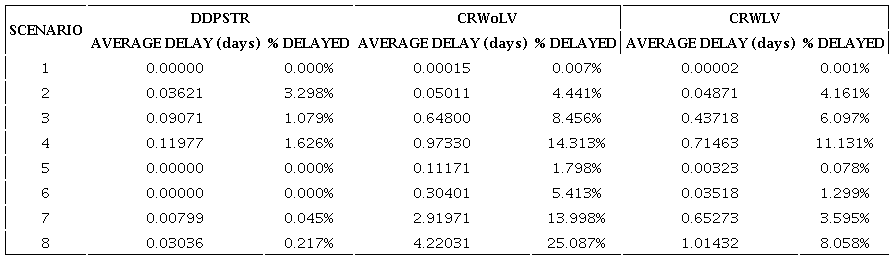 Because the delivery times had adjusted according to the variations in lead time, comparisons between scenarios were compromised. However, by analyzing Tables 1 and 2, we can conclude that reductions in lead time decreased system performance since the protection (in the form of time) of the system was decreased. In addition, increases in resource variability, even with a better offered delivery times, worse the performance.