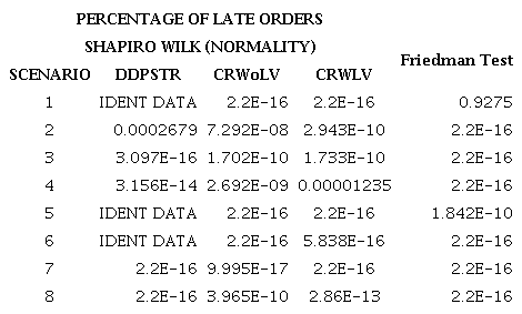 Regarding the performance of the methods, DDPSTR performed better than CRWoLV and CRWLV in all scenarios, with a significant statistical difference in all of them, except for scenario 1. It is worth noting that scenario 1 – as well as scenario 2 – have the bigger protective capacity in resources with the lowest levels of variability in demand and processing time. This allows the system to handle practically all order requests, reducing the relevance of having a rejection rule.