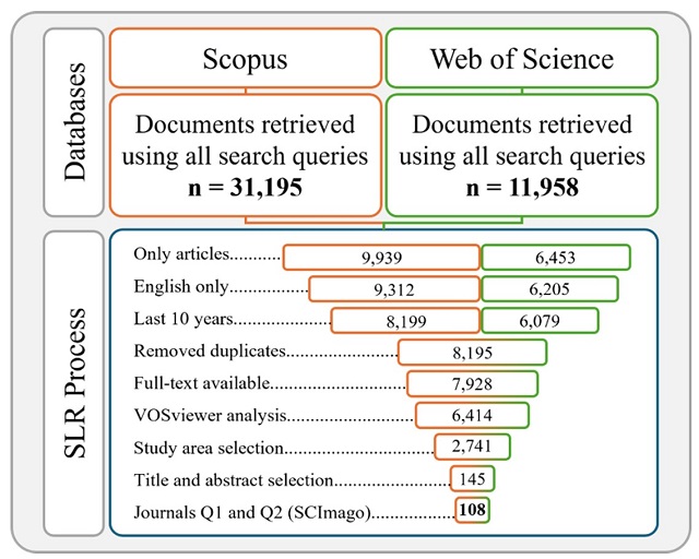 As a result, only studies that fulfilled both inclusion criteria were incorporated into the review, resulting in a total of 145 articles for evaluation and selection based on full-text reading. Before the full-text reading, a pre-selection based on journal classification was performed, including only Q1 and Q2 journals according to the Scimago Journal Rankings (SJR) scale. Sengers et al. (2016) recommend using frequently cited bibliographies and newspapers with a high impact factor to obtain a high-quality review. Therefore, 108 articles were retained for full-text reading and extracting relevant data for this research after this selection process.