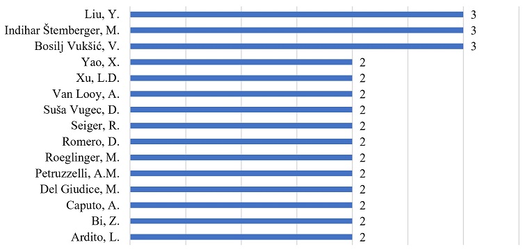 The Bibliometric and Content Analysis were performed based on the reading, interpretation, and comprehension of the selected research in the Systematic Literature Review. Initially, the articles’ characteristics, such as publication countries, authors, journals, and more, were examined. This analysis was based on completing the 108 previously selected articles. The bibliometric analysis aims to explore the authors, the year of publication, the keywords, and the journals. From the 108 identified articles about the most productive authors in the literature, as illustrated in Figure 3, 15 authors wrote more than one article, while another 307 authors contributed only one.