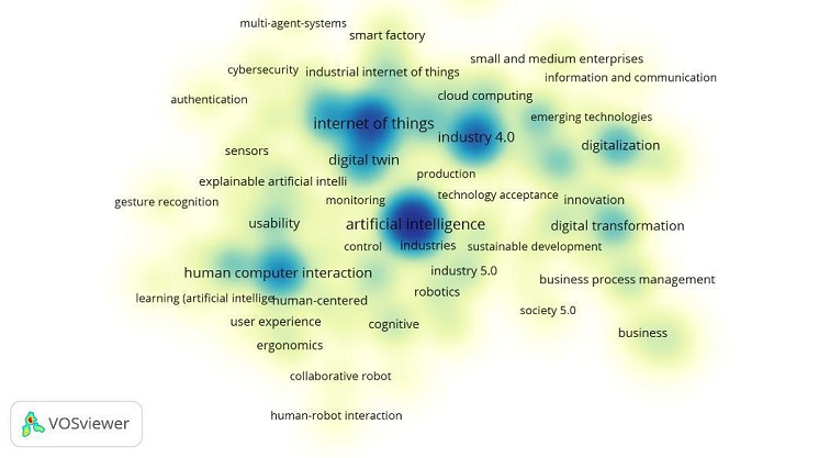 Our findings on research productivity indicate that at least 74% of the articles were published during the past five years. These numbers indicate the research trend in these topics and show that research productivity increased from 2018 onward (see Figure 4). The most frequent keywords among the articles are shown in the word cloud in Figure 5. The most used keywords in the articles were “Industry 4.0”, “Artificial Intelligence”, “Digital Transformation”, “Internet of Things”, “Business Process”, “Digitalization”, and “Human-Computer Interaction”.