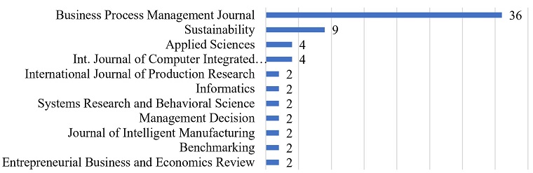 In addition, it is essential to analyse that 108 articles are distributed in 52 different journals, of which two journals receive relevant attention: Business Process Management Journal and Sustainability (see Figure 6). Only 11 journals had more than 1 article, and the other 41 journals had one each.