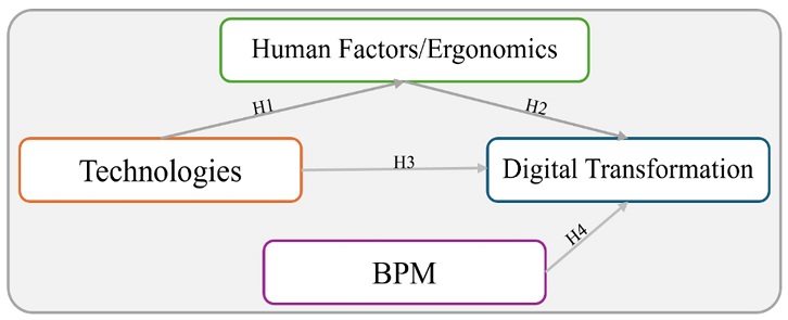 So, based on the theoretical study in the previous section, this research developed the hypothesis to examine the relationship between the DT and the relation among HFE, BPM and technologies. The hypotheses (H) of the model were formulated for testing in this research are detailed below: