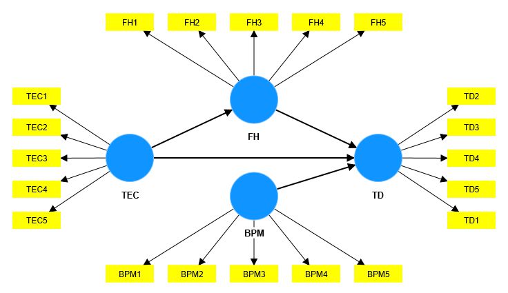 Finally, examining the highest loadings of the indicators for each construct, we have indicators TD1 (By optimising operations, digital tools contribute to more efficient execution of daily tasks), FH5 (Usability and user experience are significant factors regarding the use of technologies by employees), TEC2 (Interoperability allows various systems to communicate with each other and share real-time information), and BPM1 (The use of indicators for business process management contributes to monitoring the level of performance or success of a company's objective).