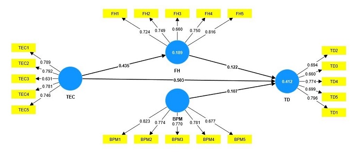 In Figure 9, the values presented within the blue circles indicate how much of the variance of the latent variable is explained by the other latent variables contained in the structural model. In contrast, the values presented on the arrows, referred to as path coefficients (β), explain the strength of the effect of one construct on the others. Evaluating the degree of variance explanation of the target endogenous variable, in this case, TD, the R^2 was 0.412, which allows us to conclude that the three latent variables evaluated (TEC, FH, and BPM) weakly explain 41.2% of the variance of TD moderately.