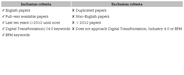 Inclusion and exclusion criteria were defined based on the research questions and the general characteristics of the articles found during the identification stage. The application of inclusion criteria selects articles from the pool gathered in the identification stage with characteristics that might address the research questions. On the other hand, exclusion criteria are used to eliminate works that do not cover relevant issues for the study or are duplicates. The articles that meet all the inclusion criteria are selected for further analysis. The inclusion and exclusion criteria were applied to the article’s title, abstract, and keyword sections. The requirements are presented in Table 2.