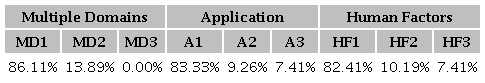 Based on these data, it was observed that there are some underexplored issues in multiple domains, specifically in items (MD2) and especially (MD3), and in the application and evaluation of proposals in items (A2) and (A3). Regarding multiple domains, none of the articles addressed all four areas of this research, and only 13.89% considered three of them. Concerning application, most articles did not present an application or case study of the framework or approach proposed in the article; 9.26% presented a practical application example without evaluating or validating the proposal, and 7.41% offered some type of proposal evaluation. Lastly, 10.19% considered human factors, and only 7.41% specifically considered cognitive/organisational factors.