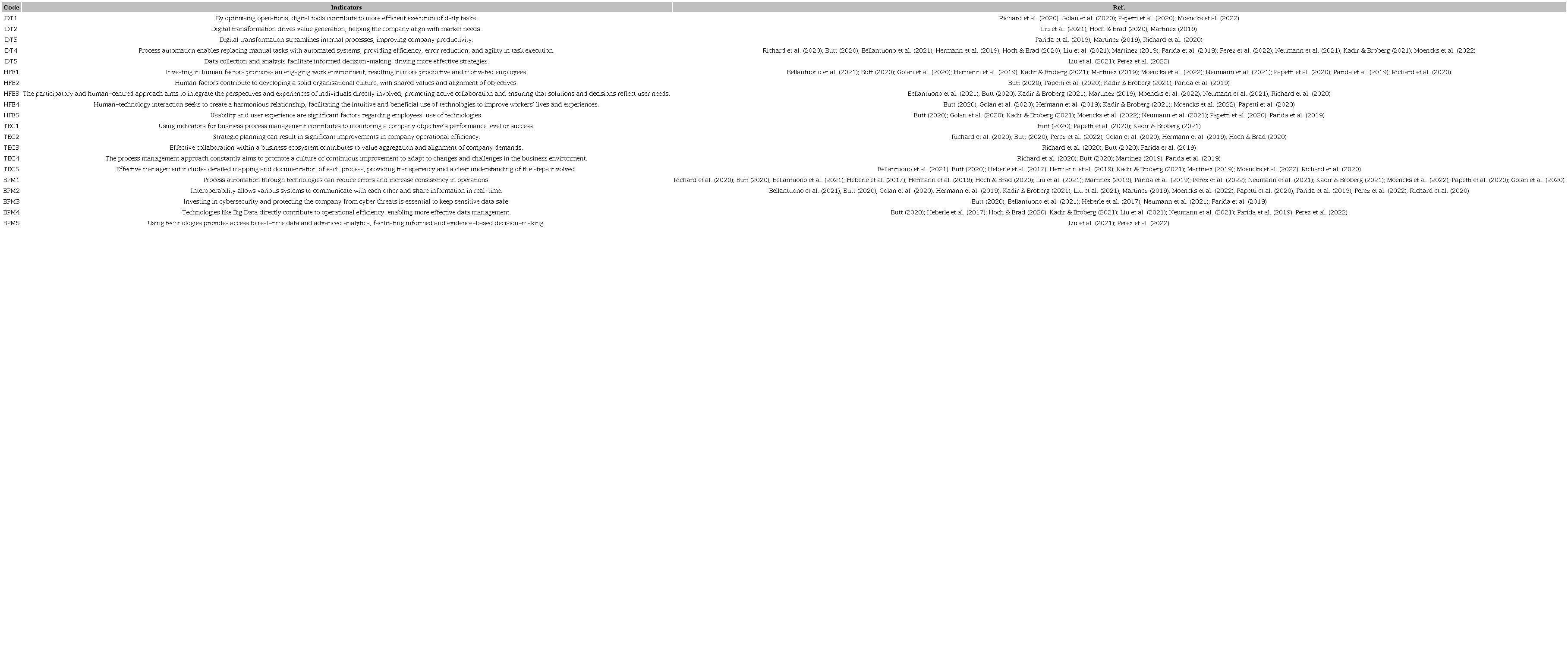 From a methodological perspective, this study contributes to the literature by employing SEM to analyse the complex, multidimensional relationships between DT, HFE, and BPM. While SEM has been widely used in management sciences, its application in exploring the cognitive dimensions of DT remains limited. By leveraging this technique, we provide a nuanced and statistically robust analysis of how digital transformation strategies can be designed to enhance both efficiency and employee well-being.