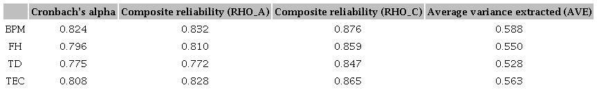 Most indicators exhibited loadings exceeding 0.708; only indicators TEC3, FH3, BPM5, TD2, TD3, and TD5 showed values slightly below but close to the recommended value. Additionally, the model demonstrated satisfactory Cronbach's Alpha, Composite Reliability, and AVE; the indicators were retained for these reasons.