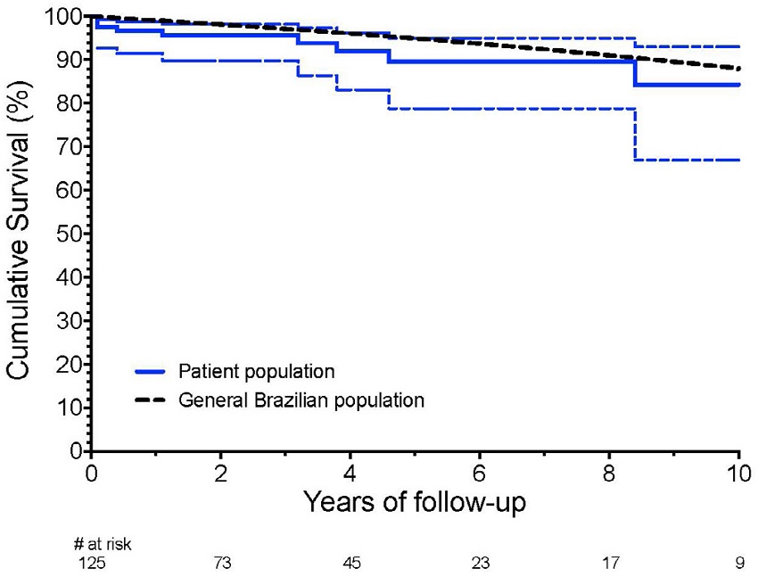 Statistical analysis was conducted with The R Project for Statistical Computing statistical software (www.cran.r-project.org/ version 3.3.1) and Graph Pad Prism Software (www.graphpad.com/guides/prism/7/). Data were presented as frequencies or means with standard deviations. The Kaplan-Meier method was used to estimate survival and freedom from morbid events, and results were considered meaningful up to 10 years. For outcomes other than death, patients were right censored in case of a late death. Age- and sex-matched Brazil general population survival estimates for the year 2013 (median year of surgery of the study cohort) were obtained from data published by the Instituto Brasileiro de Geografia e Estatística (http://www.ibge.gov.br), and statistical comparison with survival rates from the study cohort was done using a one-sample log-rank test.
