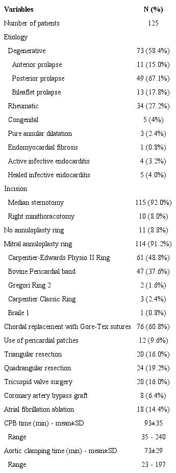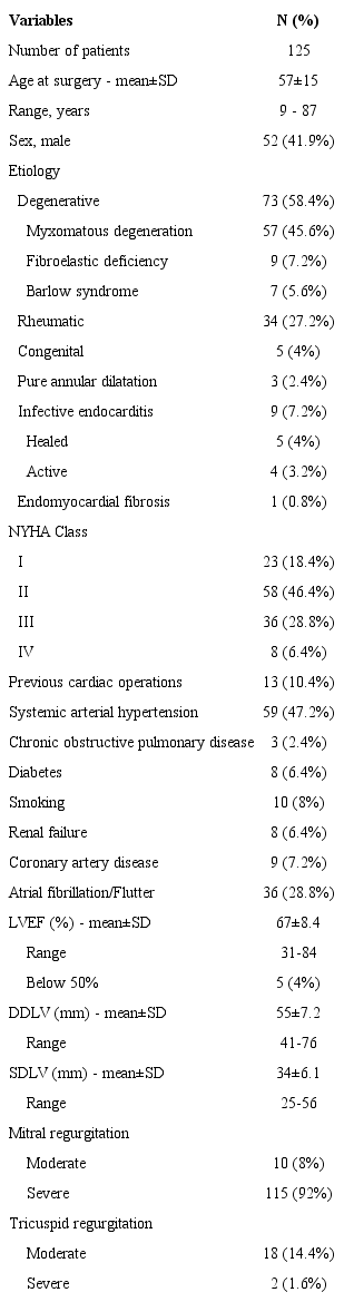 The demographics of the 125 MVR patients are summarized in Table 1. Mean patient age was 57±15 years (range: 9 - 87 years), 52 (42%) patients were males, and 23 (18%) were older than 70 years. The most common etiology was degenerative disease in 73 (58%) patients, followed by RD in 34 (27%). Preoperatively, 44 (35%) patients were in NYHA functional class III and IV, and the mean left ventricular ejection fraction (LVEF) was 67±8%. MR grade was considered severe in 115 patients (92%) and moderate in the remaining 10 (8%).