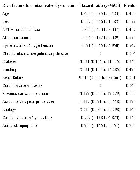 Univariable analysis was carried out with chi-square tests and log-rank test to determine the risk factors for reoperation and valve failure, and they were considered significant when P<0.05. Predictors were expressed by their hazard ratios (HR) with 95% confidence intervals (CI). Variables tested included patient's age, gender, New York Heart Association (NYHA) functional class, etiology, AF, systemic arterial hypertension, chronic obstructive pulmonary disease (COPD), diabetes, smoking, renal failure, coronary artery disease (CAD), previous cardiac operations, concomitant procedures, cross-clamp, and extended extracorporeal circulation (ECC) times.