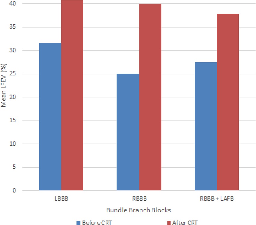 The mean LVEF before CRT was 29±7% and the mean LVEF after CRT was 39.9±13.1%, indicating a statistically significant increase in LVEF after CRT (P<0.001) (Table 3). Differently, the LVESV before CRT was 265±59 ml and the mean LVESV after CRT was 152±59 ml (P<0.01). The mean LVEF of the patients stratified by electrogram abnormalities (LBBB, RBBB, and RBBB+LAFB) before and after CRT are shown in Figure 1.