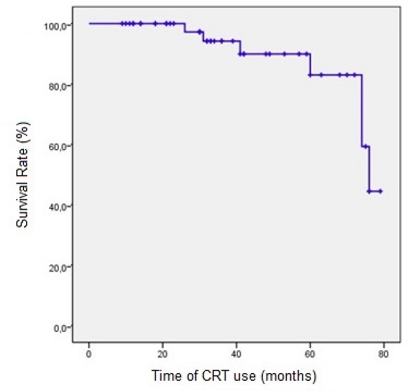 The overall survival rate of responder patients estimated by the Kaplan-Meier method was 100% at 12 months and approximately 45% at 72 months. In the analysis adjusted by age (<40 years and ≥40 years), the survival rate was the same in both groups; therefore, there was no difference in response to the therapy due to age. However, no individuals under 40 years old had used CRT for 60 months (Figure 3).