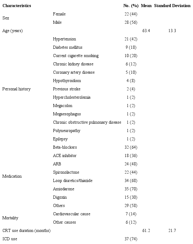 Methods: This is an observational, cross-sectional and retrospective study. The records of 50 patients with CRT pacing devices implanted between June 2009 and March 2017 were analyzed. For statistical analyses, Pearson's correlation was used along with Student's t-test, and survival was analyzed using the Kaplan-Meier method. A P value of <0.05 was considered significant.