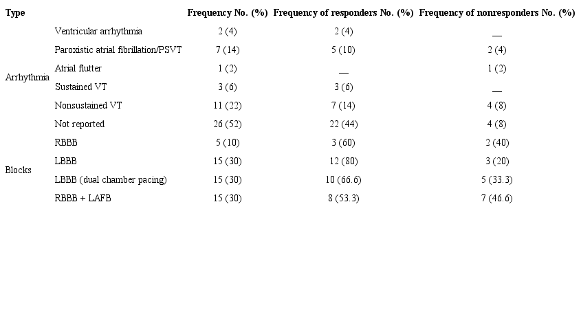 The electrophysiological disturbances, like the presence of arrhythmias and bundle branch blocks, are shown in Table 2. Arrhythmias were identified in patients; nonsustained ventricular tachycardia (VT) was the most frequently observed arrhythmia (22% of patients), followed by paroxystic atrial fibrillation/ paroxysmal supraventricular tachycardia (PSVT) (14%) and sustained VT (6%).