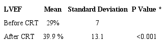 Our study showed a significant increase in the mean LVEF before and after the use of CRT. In agreement with our finding, other studies also showed a significant increase in this parameter[28,31]p>.