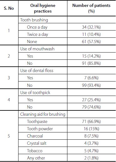 Approximately two-thirds of the patients did not brush their teeth daily, and only 10.4% brushed twice a day. Twenty-three percent of patients reported using cleaning aids other than toothpaste, such as tooth powder, charcoal, burnt tobacco, etc. Cleaning the interdental spaces using a floss or toothpick was uncommon, although the use of toothpick was reported more often than floss. Table 2 shows the main results of oral hygiene practices and behaviour of CVS patients.