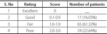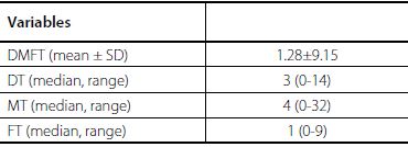 Approximately 68% of the patients experienced dental caries as decayed teeth or missing teeth due to caries and filled teeth. Approximately 41 (38.6%) of the study subjects had one or more decayed teeth, 56 (53%) had missing teeth due to caries and 18 (16.9%) had a filling. The mean DMFT score was 1.28 (SD=9.15) with predominance from missing and decayed components. Table 3 shows the details of DMFT score among the study population.